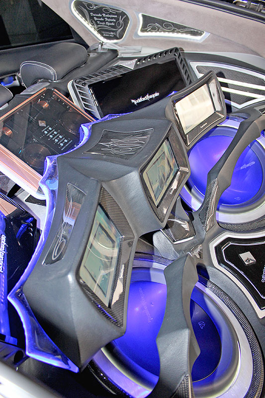 「派手さ」と「渋さ」をトコトン極めたラゲッジスペース。作りものにはほとんど直線がないこともポイント。モニタータワーに関しては、3枚のモニターがすべて異なった角度で設置されていて、装飾パーツにおいても曲線が多用されている。いわゆる『ジグ』と呼ばれる既成の『型』を使うことなく、すべてがワンオフデザインというところもサスガ♪
