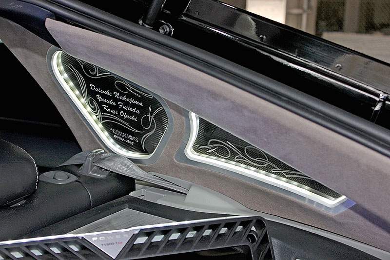 両サイドのウォールに入れられた装飾パネルは、MDFで製作したベースパーツにアクリルのバーを2本埋め込み、それ以外の部分にカーボンを貼った。外周には削りだしたアルミプレートをセット。アルミの内側は45度でスラントさせていて、アクリルバーから発せられる光がスラント部分で乱反射するように計算されている。ウインドー部分にもカーボン & アクリルの装飾パーツを装着している。