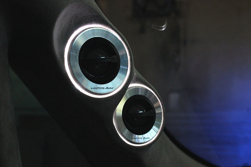Aピラーはグレーのスエードでフィニッシュ。ツイーターの周りに細くアクリルのリングを仕込み、渋くライティング。ツイーターの周囲のアルミリングはライトニングオーディオの純正。リーズナブルなモデルにしてこの高級感はバリューが高い。センターコンソールのサブウーファーボックスは、バッフル面をスエードで、それ以外はレザーでフィニッシュしている。有機的なデザインが印象的。