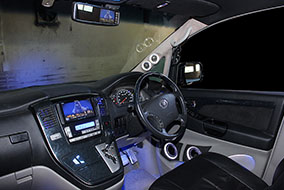 間接照明を上手に使って、ナイトシーンではコクピット全体をムーディに演出。フロントシステム用のセンターユニット、カロッツェリア・DEH-970は、センタークラスター下部にインストールされている。このユニットも価格・3万6750円というお手軽モデルであるにも関わらず、抜群なオーディオ性能を誇る名機だ。