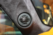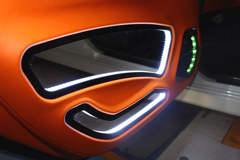 インテリアでの最大の見せ場はドア! 全面に生地を張り、フルカスタムされている。ちなみに、このクルマが仕上げられてきた2年間の中で、ドアは3回バージョンアップされた。スピーカー交換→アウター化→フルカスタム、という具合だ。スピーカー後方の装飾パネル部分は、奥側にブラックのアクリル、LEDが仕込まれた乳白色のアクリル、そしてその上にもう1枚リング状のブラックアクリルを重ねるという3層構造が取られている。