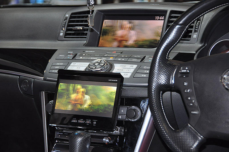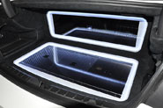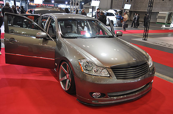 岡山県から参加していたサウンドマリーナの展示車フーガはシンプルさを損なわずにボトムアップされた外装が印象的。ソースユニットはcarrozzeria サイバーナビを使い、LED装飾と共にロックフォードの2wayがアウターでインストールされている。迫力あるラゲッジオーディオはロックフォードで統一され、LEDやアルミ素材を使いながらの3Dインストール。製品の配置や見せ方の美しさが感じられるクルマであった。