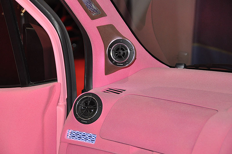 広島県から参加したTruthの展示車は艶消しピンクが目を惹くムーヴで会場では特にユーザーの目線を集めていた1台。内装も貼り替えやフロッキー加工を駆使して色合いの統一を高品位に行っている。ソースユニットはcarrozzeria X RS-D7Xlll+RS-P99Xとし、ロックフォードの最上級スピーカーJ5をアウターで装着。ラゲッジを埋め尽くすパワーアンプとサブウーファー、外向きスピーカーはロックフォードで統一されている。大部分がピンクで目立つのは当然なのだが、ポイントポイントで使われるLEDによって引き立つ、センスの高さを感じさせるクルマであった。
