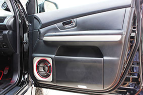 ドアのミッドウーファー周囲のアクリルを光らせ、差し色であるレッドをアクセント的に取り入れた。アウターバッフルのデザインは、ラゲッジのデザインと統一感あるスパルタンなテイスト。