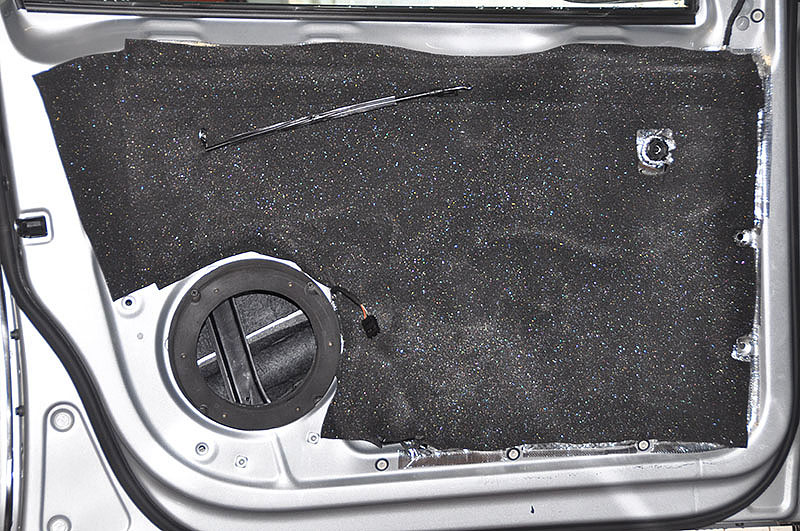 内張のデッドニングも欠かせない要素の一つ。基本的に内張はPP素材で出来ていて、かなり振動を伝えてしまう物が多い。振動するということは音を発生させるわけで、その音は不要な音として車室内に発せられるのだが、その音が音の曇りに直結してしまう。いい音にしたい! ということはスピーカー以外から余計な音をさせないということが非常に重要となってくる。ここでもStP Aero BOMBを使って、押したり叩いたりしながら適量を貼っていくことで弱い部分を重点的に補強をしてから仕上げにインナーパネルと同じようにBIPLAST PREMIUM5mmを全体に貼ることで余計な音を大幅に遮断することが出来る。更に今回はスピーカー背圧の拡散にも注目してREAL SCHILD ディフュージョンをスピーカー裏中心にブロック状で手の届く範囲に貼っていくことにする。背圧を処理することでスピーカーの動きがスムーズになったり音の濁りの原因となる定在波の緩和に繋がる重要な処理だ。