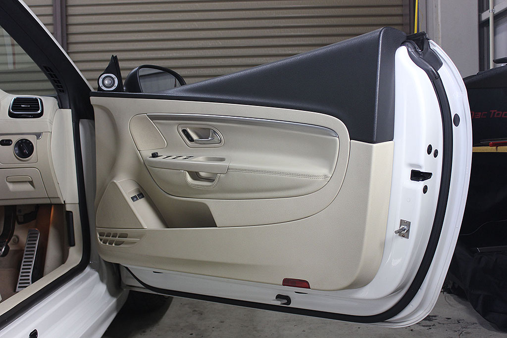 左右のドアも生地を張り替えつつ、ミラー裏以外の内張りの形は変えられていない。ミッドレンジと、ミッドウーファーは純正位置にインセットされている。ヘッドユニットにはカロッツェリアXを採用。