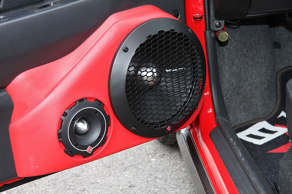 ACG常連メンバーであるアルトワークスのオーナー渡辺さんは、軽カー部門にエントリー。製作はカーファイ。高能率のマリン用スピーカーをドアにしっかりとセット。そしてAピラー、ダッシュ脇にホーントゥイーターをビルトイン。パワーアンプはOTOKO(男)を3台使用。尾林音吉 & MC★KAMO監修、特別賞ステージ前1位を獲得。パワフルで強靭。そして身体にぐっとくる音を放つ。