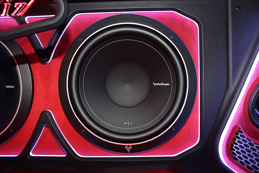 サイドウォールには、パンチングメタルをアクセント的にセット。外向きスピーカー、サブウーファー、パワーアンプはすべてロックフォードで統一している。サブウーファーは30cmの大口径モデル。