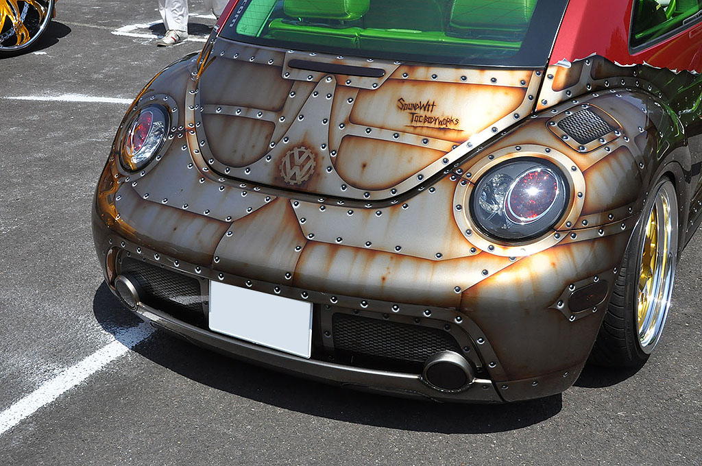 北海道のサウンドウィットからインポートクラスにエントリーした濱さんのニュービートルは、冬の間にコンプリート一直線のフルカスタムを行ってエントリー。オールペンされた特徴的なレッドボディーに細部まで拘り抜かれたブラシワークは驚くほど秀逸。立体的にリアルにクルマをキャンバスにして描かれている。内装もトーンの違うグリーンを使い、純正のままで装着されている部品は皆無。まさにコンプリートカーという仕上がりだ。オーディオはナビヘッド+ライトニングオーディオで固められ、ハイコストパフォーマンスな気持ちよいサウンドが聴ける楽しさを詰め込んだクルマであった。