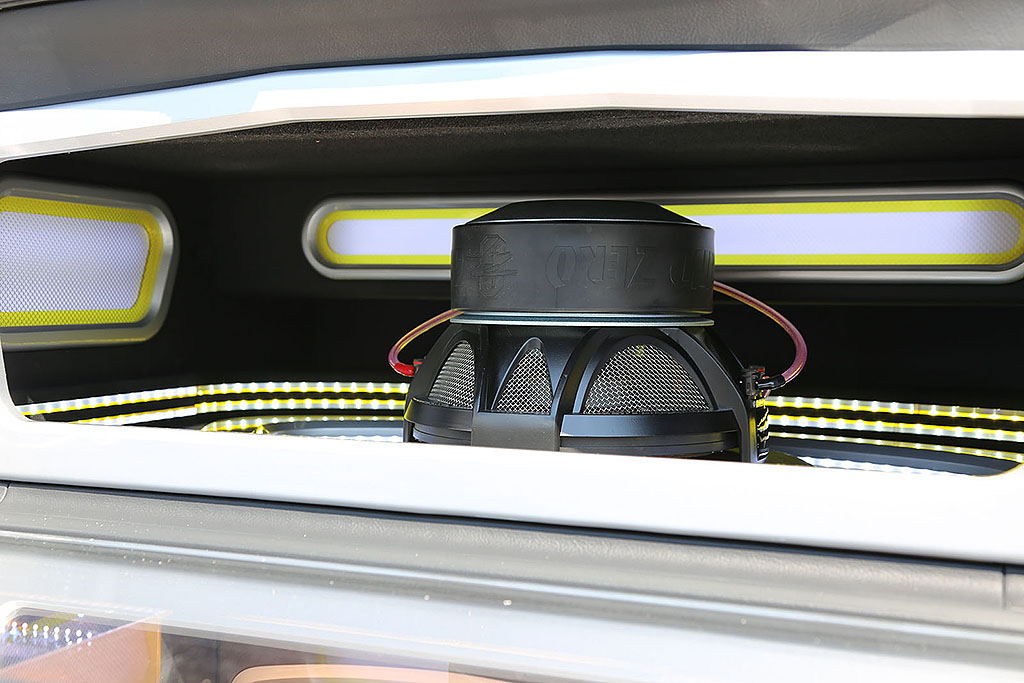 トランクに2基並んだグラウンド・ゼロのGZPA Reference 2XSが、モーターアクションで左右に移動。その下から3基目のパワーアンプが姿を現す…というギミックが特徴の、asu.Companyデモカー。『上級モデルを使い、聴いても見ても楽しめるシステム』を、制作コンセプトに掲げている。パワーアンプ3基とサブウーハー1発、ミッドレンジ4発(2セット)をトランク内に収め、スピーカーは左右ドアのミッドも含め、全てグラウンド・ゼロで統一。ハイパワーなのはもちろん、ヘッドユニットにダイアトーンNR-MZ80PREMIを採用し、臨場感タップリの音響を実現させた。