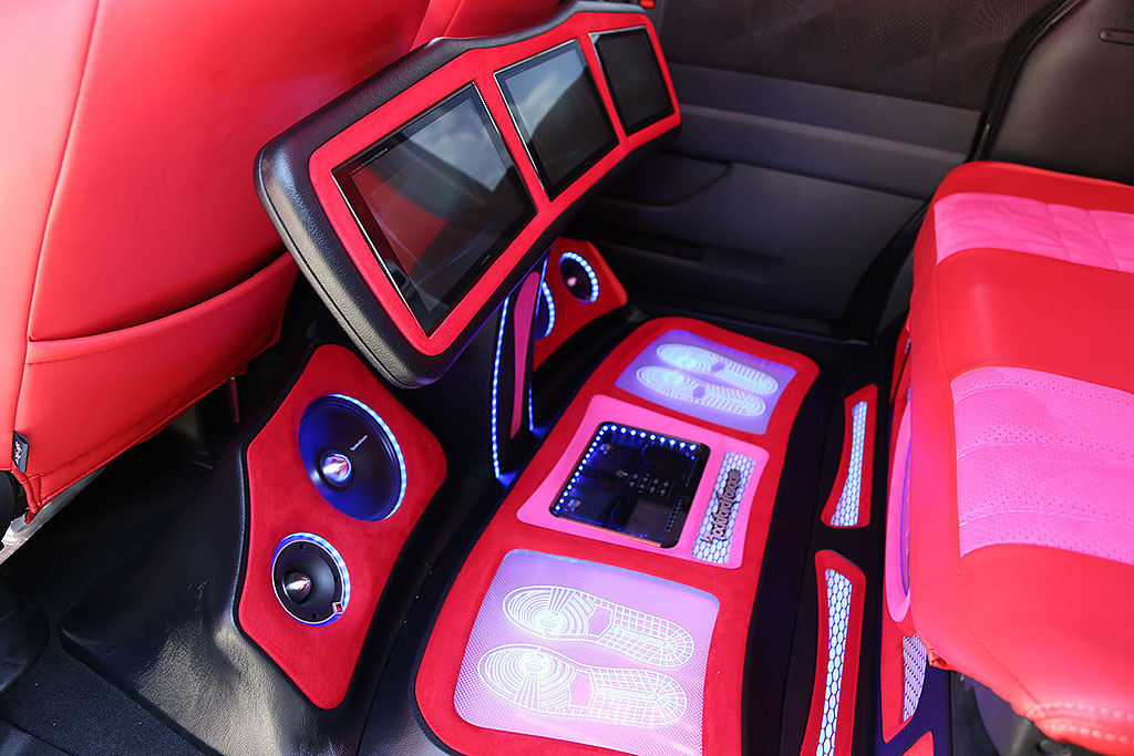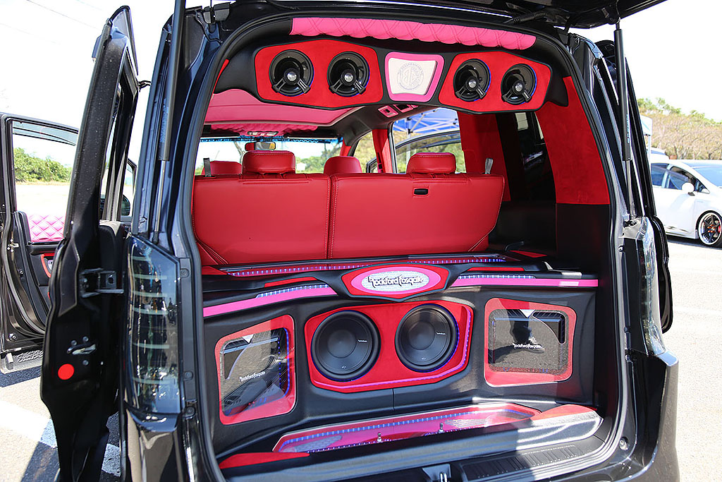 Brain Childのデモカーは、アルパインのBIG XプレミアムとIVA-D800Jからの音源を、ロックフォードのデジタルプロセッサーと4基のロックフォードT500でコントロール。運転席ポジションでは「音質仕様」で。後席では、足下から突き上げてくるサブウーハーの重低音と3連モニターの「シアター仕様」で、オールジャンルの音楽を楽しめるよう作り込んだ。ちなみに、2ndシートを取り外してリムジン仕様とした後席は、3rdシートを純正位置から若干前方にずらしてトランク容積を大きめに取り、オーディオカスタムを激アピールしている。