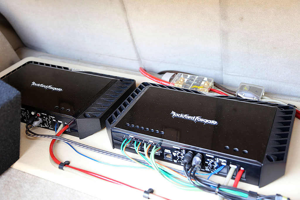 結婚前から乗っていたという、逆輸入RX。オーディオを作り込むのは初めてとのことだが、お子さんの誕生に合わせてクルマを代替えする可能性もあるので、「そのまま積み替えられる形状」をテーマに、R1-1X10のウーハーボックスと2基のロックフォードT400-4、クロスオーバーなどは、軽く固定した状態に。ヘッドユニットにアルパインのIVA-D310J、Aピラーとフロントドアにロックフォードの2Wayコンポーネントスピーカーをインストールし、ノリの良い曲から聴かせるバラードまで楽しめるようセッティングしている。