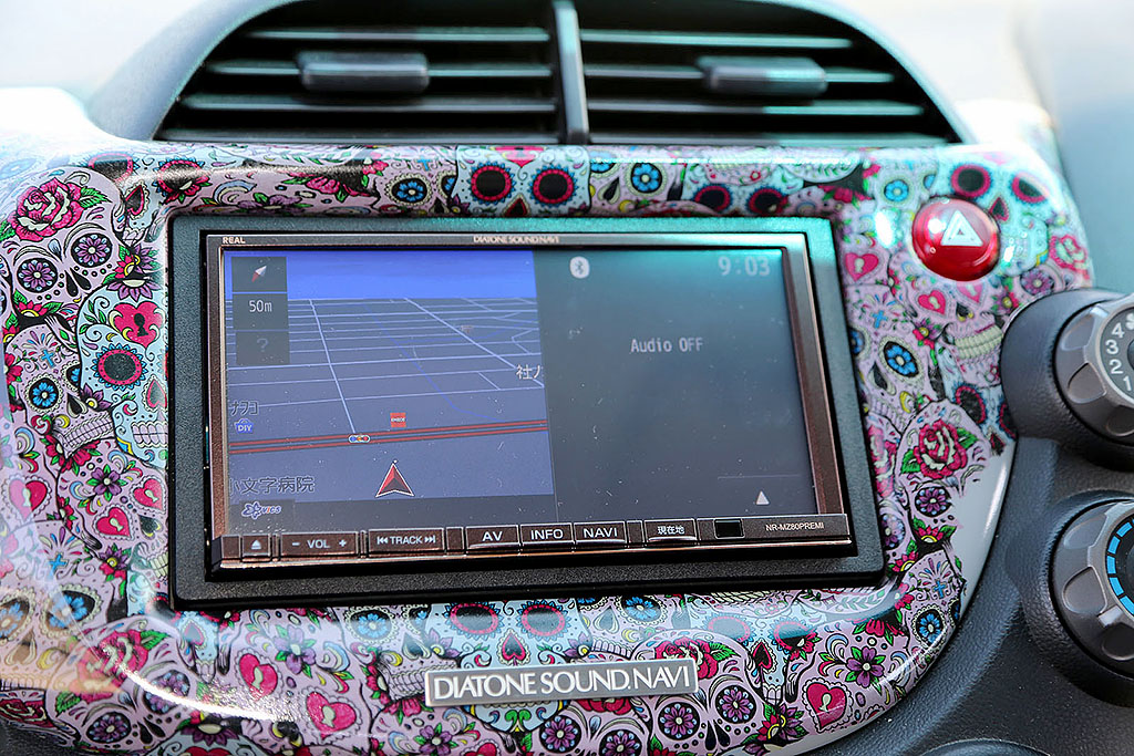 「高額になり過ぎない範囲でHi-Fiサウンドを」がテーマという施音人工房プロデュースのフィット。ヘッドユニットにダイアトーンのNR-MZ90PREMI、ドアスピーカーにダイアトーンDS-G500、パワーアンプはアークオーディオ4100SEと、“最高級”というわけではないものの、パフォーマンスに定評のあるユニットをチョイス。スピーカーの性能を最大限に引き出すためのインストールに苦労したそう。アンプを助手席足下にインストールすることでケーブルをできるだけ短くし、信号損失と出費のロスを減らした点も、テーマに則ったアイデアだ。