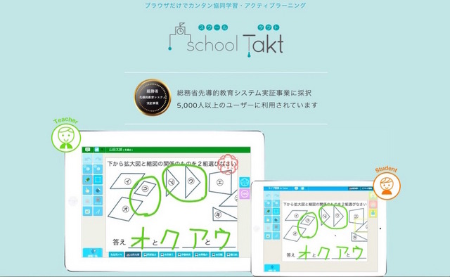 schoolTaktは、教育関連システムの開発・販売・運用を行うコードタクトが学校向けに開発した授業支援システム。パソコンやタブレット、スマートフォンなどデバイスを問わずに利用することができ、従来の授業スタイルを変えることなく導入できるシステムとして、2014年度から実施されている総務省の「先導的教育システム実証事業」にも採用されている。実証事業の中でも利用率が高く、学校現場での有用性が認められているという。