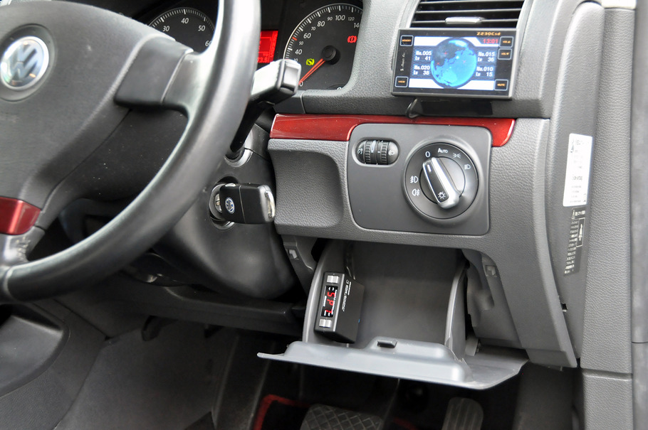 装着したのはpivotのスロットルコントローラー。スポーツモード7段階、エコモード5段階と好みに合わせて調整が可能な機種。デモカーにはVW専用ハーネスを間に噛ませて、本体の電源をOBDカプラーから取れば完了する。