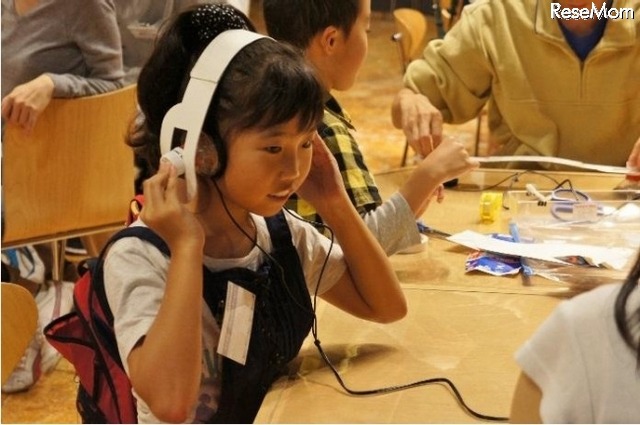 「ペットボトルと牛乳パックでつくるヘッドホン」ワークショップは、イヤホンやヘッドホンの音の鳴る仕組みや音について基本的なことを学び、家庭にあるペットボトルや牛乳パックなどを使って親子でヘッドホンを作るというもの。ソニーのエンジニアが講師となって、磁石や導線を組み立てながら、音の原理や電磁誘導の仕組みをわかりやすく説明してくれる。
