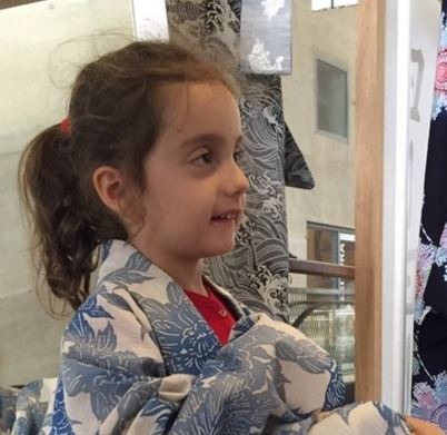 小さな女の子も浴衣試着にチャレンジ。スタッフさんも微笑みながら無理やり着付けていた。