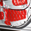 塞ぐにあたっては、ほとんどの場合、鉄板のビビリを止めるための「制振材」が用いられる。さらには、薄めのアルミパネルが合わせて貼られることもある。