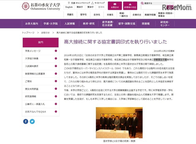 お茶の水女子大学と、浦和第一女子高校など北関東のスーパーサイエンスハイスクール(SSH)に指定されている6校の女子高校が10月25日、高大接続事業に関する協定書を締結した。今後は、大学の授業開講を予定し、お茶の水女子大学に入学した場合は学部単位を認める予定。