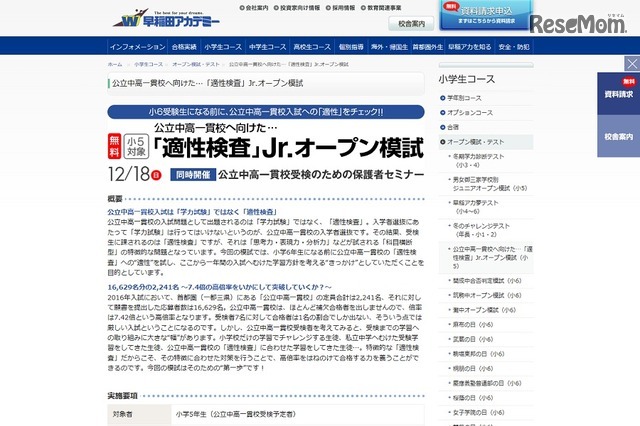 早稲田アカデミーは12月18日、公立中高一貫校を目指す小学5年生を対象とした「『適性検査』Jr.オープン模試」を開催する。費用は無料。また、公立中高一貫受験のための保護者セミナーも同時開催する。