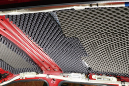 例えばフロアへの施工では、「制振材」と「遮音・断熱材」の組み合わせが基本形となる。「制振材」で鉄板の共振を止め低周波をカットし、「遮音・断熱材」で、路面からのノイズがカットされる。「制振材」は厚めのものがチョイスされることが多くなりなりそうだ。フロアは振動しがちな部位であるから、予算が許す限り、きっちりと制振していきたい。