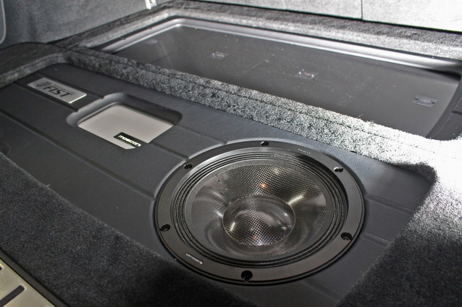 全体的なデザインテイストはオーナーの望み通り純正に近いグレー系のシックなフィニッシュが施されている。しかしパネル面には3本の不規則なスリット処理が施されているのが見どころ。単純な平面を作ることを嫌ったインストーラーが、パネルに変化を付けるためにデザイン処理を施したものだが、シンプルさを損なうことなくしっかりとデザイン性を高める加工となった。モスコニの小型プロセッサーとサブウーファー、そしてショップロゴの入ったパネルをうまく融合させる役目も果たしている。パワーアンプを設置したパネル側にも同様のデザイン処理が施され、ラゲッジ全体のデザイン上のキーワードにもなっている。