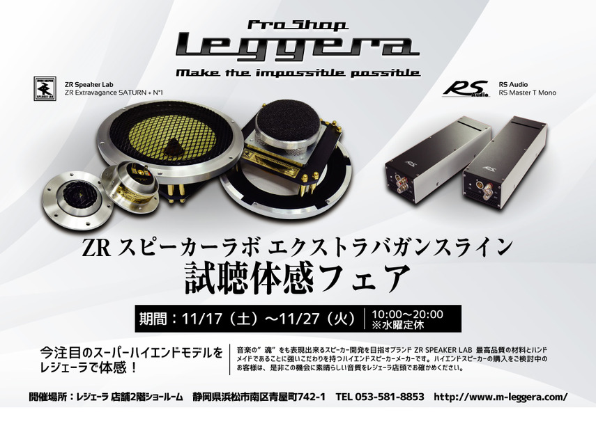 11月17日(土)~27日(火)までの期間、静岡県浜松市にあるカーオーディオプロショップLeggera(レジェーラ)にて『ZRエクストラバガンス ライン試聴体感フェア』が開催される。