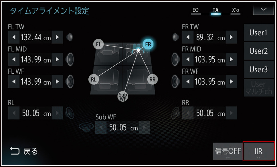 と、その前に、「タイムアライメント」を調整していく際には、「クロスオーバー調整」についても初期設定をしておいた方がいいだろう。少なくともツイーターに送り込む音楽信号にはハイパスをかけておかないとツイーターを壊してしまいかねないし、ミッドウーファーもフルレンジで鳴らすよりはローパスをかけておいた方が調整はしやすいはずだ。