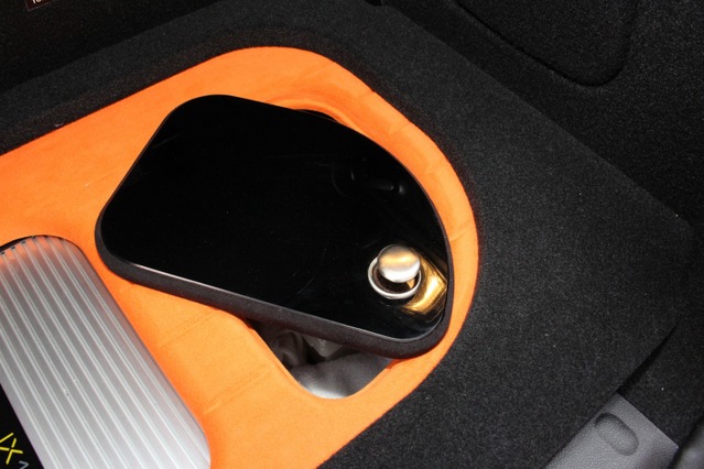 オレンジのパネル面を持ち、魅せるデザインを存分にアピールするラゲッジだが、カバーを備え実用性も兼ね備えているのも特徴。純正フロアよりもわずかに厚みのあるパネル面は中央部に一段凹んだスペースを持ち、ここに各ユニットをインストールするスタイル。パネル面はオレンジの人工スエードで処理されている。