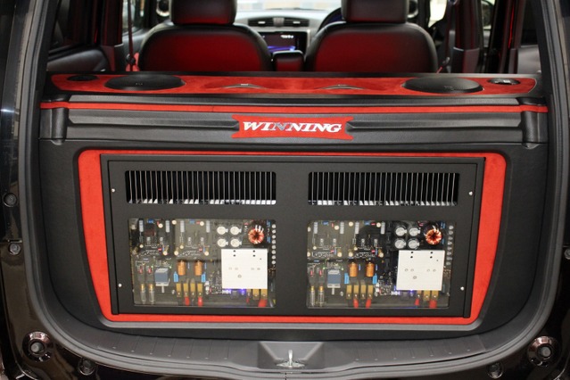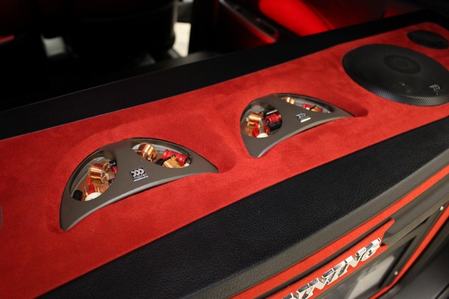 オーナーが好きだという赤/黒のカラーコーディネートを使ったアンプラックのデザインも秀逸。後方視界をしっかり確保する高さに抑えつつ、バランス良く大型パワーアンプをセット。周囲を彩る赤の人工スエードとのコントラストも鮮明。ブラックのレザーでアウトラインを引き締めているのもラゲッジに大人のムードを漂わせている。存在感満点のオーディオユニットでラゲッジを際立たせているのがリアセクションの最大の見どころとなった。