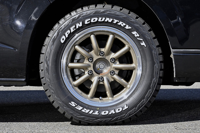 ハイエースのホイールチョイスでは大径化も大きなトレンド。しかし足かせとなっているのがタイヤで、特にバン・モデルの車検にはLTタイヤ(またはCタイヤ)の装着が必要となり大径化はタイヤに依存する。その中で、一般的に流通している最大サイズとなっているのが18インチ。それを受けてチョイスしたのがレイズの「A・LAP-07X」だ。大径化しても足もとの軽快感はスポイルしない、そんな意味を込めて鍛造モデルをセレクト。軽量・高剛性な鍛造を用いたこのモデルは足もとに高級感を与えるにも絶好。デザインの基本となるのは7交点を持つメッシュデザイン。ツインスポークはセンターパートでひとつの面になり、ホイール全体の一体感の強さでも群を抜くデザインと言えるだろう。加えてセンターパートにはブランドロゴが刻み込まれ高級感も兼ね備える。さらにスポークはリム側で大きく湾曲しリム内側を掴むようなデザインとしている。力強さを感じさせるこのデザインもハイエースの足もとには似つかわしい。またブロンズカラーはハイエースユーザーから注目度の高いカラーリングのひとつ。18インチサイズとカラーリングで存在感をしっかりアピールするのもこのホイールをチョイスの理由のひとつだ。