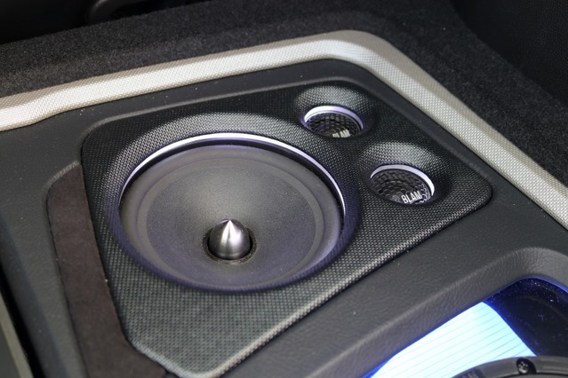 ラゲッジのトップパネルはベースはブラックのレザーで仕上げられているが、こちらも13cmスピーカーの回りはカーボン+人工スエードでバッフル面をデザイン、16.5cmのミッドバス側はアクリルと人工スエードをコンビで使うといった手の込んだデザイン。見れば見るほど入念に作り込まれたデザインは、手数の多さとは反比例して大人のムードに仕上げているのもモノトーンでまとめたカラーコーディネートと、デザインのまとまりの良さからだ。