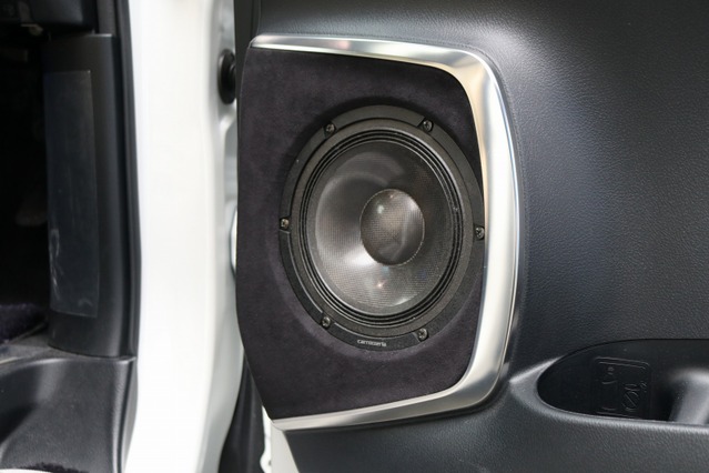 サウンド面ではカロッツェリアXシリーズのパワーアンプでドライブされ、余裕の中低域を再現。Aピラーのスピーカー群でステージの広さを表現したのに加えて、確かな中低域再生を確保し、レンジの広いバランスの取れたサウンドを再現している。
