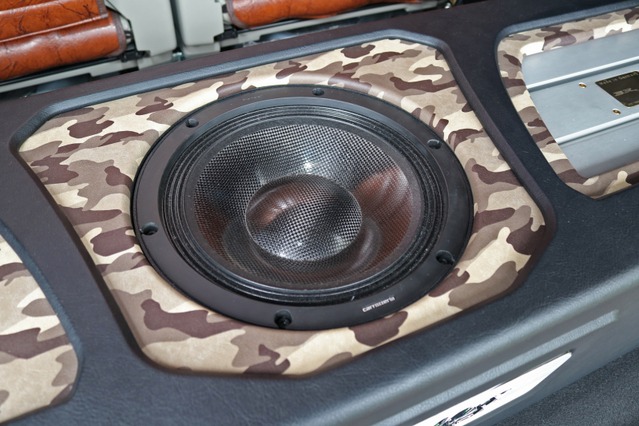 ラゲッジにインストールされているユニットはいずれもハイエンドなモデル。中央にインストールされるサブウーファーはカロッツェリアのハイエンドモデルであるTS-W1000RS。バッフル面には迷彩柄のパネルを用いてブラックの振動板とのコントラストも新鮮。