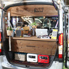 ハーテリーハーテリーの新作はワゴンルックショートバンパーVersion。その名の通りエブリイ・バンに取り付けることでワゴンフェイスにスイッチできるパーツ。リアまわりも同様にワゴンチェンジ可能だ。内装はルーフコンソールやベッドキットなど、充実の装備を投入し使い勝手も同時にレベルアップした。