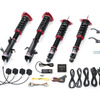 「DAMPER ZZ-R」は幅広い減衰力調整によりストリートからサーキットまで、あらゆる走行シーンに対応できる単筒式(モノチューブ)構造採用の全長調整式&32段減衰力調整車高調キット。アルミ製のアッパーマウント、ロックシート、ブラケット(一部)を採用し、高い強度と軽量化を両立している。