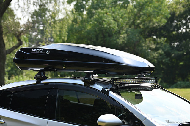 選ぶときの基準としたのが畳んだ状態のペットカートが入る大きさ。特に気にしたのが厚さで、ペットカートは畳むと高さが30cmになるらしく、必要以上に厚さのあるルーフボックスは嫌だったので高さ40cm未満の製品を探す。長さに関してはあまり長いと横から見たときにリーゼントっぽく見えてしまうので入念に実車でシミュレーションした結果から2m未満の物を探した。国内でよく見かける3メーカーでも探してみたけれど、自分の妙な拘りで“人と同じのは載せたくない!”という精神が出てきて、グリグリと探しまくって見つけたのが今回搭載したオランダメーカー『ハプロ ゼニス6.6』という製品だ。