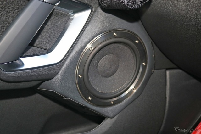 今回フロントスピーカーを3ウェイ化する上で特にこだわったのがミッドレンジのチョイスだった。オーナーの好みはコーン型のユニットだった。中域のサウンドをコーン型で再現したかったことから選んだのがマトリックスシリーズの中でも80mmコーン型を採用しているマトリックス-3.1だった。Aピラーの付け根付近にインストールすることでコクピットのデザインとも違和感なく融合させる。