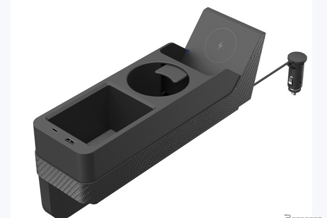 で、当品は機能が充実しているところがストロングポイント。まず前方部分はスマホスタンドになっていて、ワイヤレス充電も行える。最大15Wの急速充電にも対応し、過電流保護、過電圧保護、過熱保護、異物検知機能も搭載済みだ。そして中央部にはドリンクホルダーを装備する。直径72mmのボトルまで対応し、細缶をしっかり固定できる可動フラップも装備する。そして後部は小物入れになっていて、最後部にはUSB充電ポートも備える(タイプAとタイプCポートが1口ずつ)。なお電源はシガーソケットから取れる。コード長は1m。