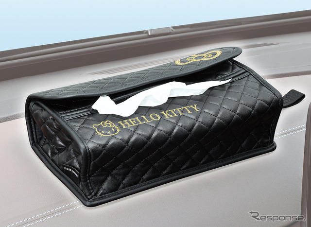 当品はキティのリボンをアイコン的にあしらったキュートなアイテム。しかしながらブラック&ゴールドのカラーが大人っぽくもあり、幅広い層が使用できそう。ちなみに底面には特殊ラバー素材が使われているので、ダッシュボードの上に置いたときに滑りにくい。また、ストラップが付いているのでヘッドレストにもかけられる。使いやすくかつおしゃれなティッシュカバーを欲していたのなら、当品がお薦めだ。
