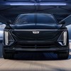 フロントフェイスにはキャデラックの象徴、縦長のLEDヘッドランプを採用。上部のスワイピングLEDウィンカーとともにワイド&ローのフロントスタイルを際立たせる。また、紋章部はブラックのクリスタルシールドと組み合わされており、電気自動車らしい新たな面持ちとなっている。