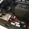 ラゲッジ右側には電源ケーブルや電源強化関連のパーツを集約するレイアウトもこだわりだ。各種電源強化パーツを組み込むことで電圧を昇圧し、ユニットの持つポテンシャルを存分に引き出すことが狙いとなった。その結果オーナーが目標にしていたリアルさを手に入れるに至ったという。
