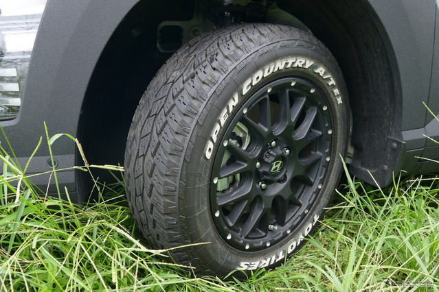 ほかに外観ではマッドガード、ルーフクロスバー(試乗車はTHULEのキャリアバスケットも装着していた)、ベルトラインのブラックモールや、マットブラックのエンブレムなども独自仕様だ。それと今どきのセンスで選ばれたWeds社製16インチアルミホイールとホワイトレター付きの205/65R16オールテレーンタイヤ(TOYO OPEN COUNTRY A/T EX)が足元を引き締めている。