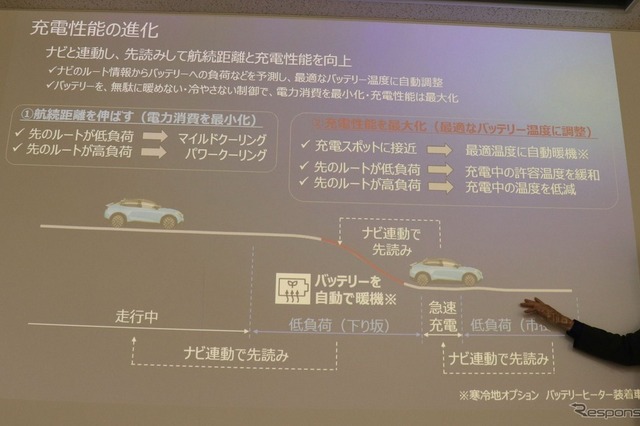 プレコンディショニング機能は、ナビとも連動し、走行距離、ルートの勾配による発熱量を考慮したバッテリー状態の制御を可能としている。これにより、充電前後にバッテリーの温度を効率のよい最適な温度にすることができる。