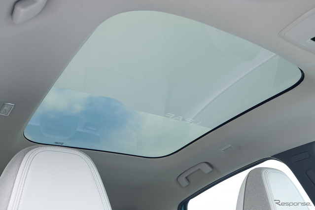 EVにつきものな装備にパノラマルーフがある。新型リーフにもパノラマルーフが装着された。液晶シャッターによる遮光タイプのガラスルーフのため、シェードを省略している。シェードなしで日本夏を越せるのか、と気になるが、日産の実験・テストでは一般的なシェードと同等な遮熱効果があるそうだ。UVタイプのハッチバックでCd値0.26を実現しながら後席のヘッドクリアランスが十分に確保された。試乗した範囲では、身長180cmある記者が座っても頭が使えることはなかった。なお、膝前スペースも確保されていた。