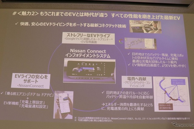 3代目の進化は、2代目リーフまでの課題やユーザーの要望について、ほとんどの回答をだしてきたといえるだろう。航続距離、充電性能、Google連携、V2Lアダプタ、統合熱交換システム、バッテリーのプレコンディショニング、遮熱ガラスルーフなどEV基本性能の進化がめざましい。