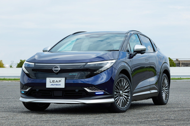 撮影用に展示されていた「AUTEC(オーテック)」バージョンを簡単に紹介する。内装がブラック基調となり車内の雰囲気がかなり変わる。AUTECバージョンの主な装備は、フロントグリル両サイドにドットパターンの部分があり、エンジン車風の装飾、その下に配置されるブルーのシグネチャーランプ、19インチ専用ホイール、金属粉を使った特殊塗装(メッキではない)の加飾がされたエアロパーツなどだ。AUTECバージョンが用意されるなら、当然NISMOバージョンも期待したい。