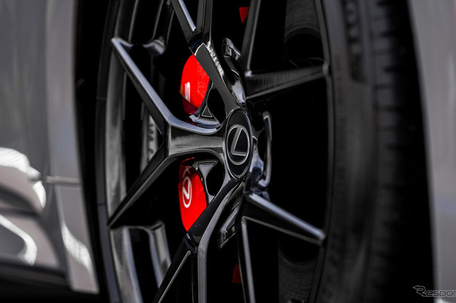 展示車両には新色のウィンドペイントが採用され、F SPORT専用デザインが施される。赤色ブレーキキャリパー、ダークグレー19インチホイール、トリプルビームLEDヘッドライト、新設定のラディアントレッド内装色などが特徴だ。