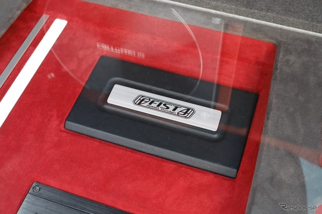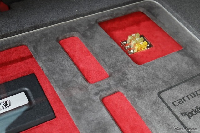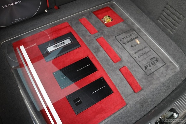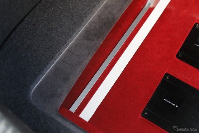 フラットに組まれたベースパネルには2台のデジタルアンプ(カロッツェリアのPRS-D700)をインストール。ここでもコンパクトなユニットを使ったシンプルなデザイン処理にこだわった。レッド×グレーのレザー色のコントラストや左右非対称のパネル構造、さらにはブランドロゴを配することでデザイン性を高めたパネルがラゲッジを美しく仕上げている。