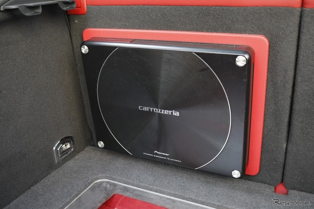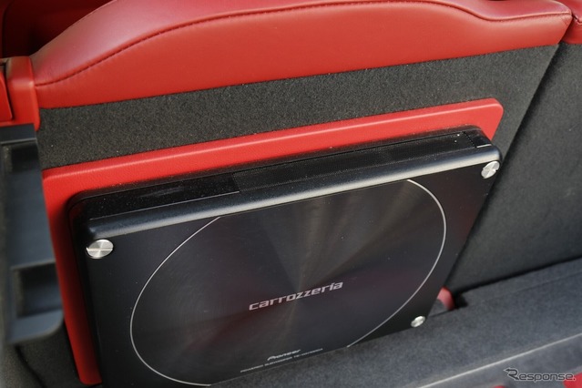 ラゲッジ前方のウォール面には薄型サブウーファーであるカロッツェリアのTS-WH1000Aが取り付けられている。HVT方式と呼ばれる振動板駆動方式を採用することで超薄型設計を実現したユニットだ。その独特の省サイズでウォールへの貼り付け固定が可能になっている。ベースパネル(こちらもしっかりレッド処理)を設けて、そこにサブウーファーを固定する構造。ラゲッジのすっきり感を高める取り付けとなり、オーナーが望んだ通りのスタイルとなった。